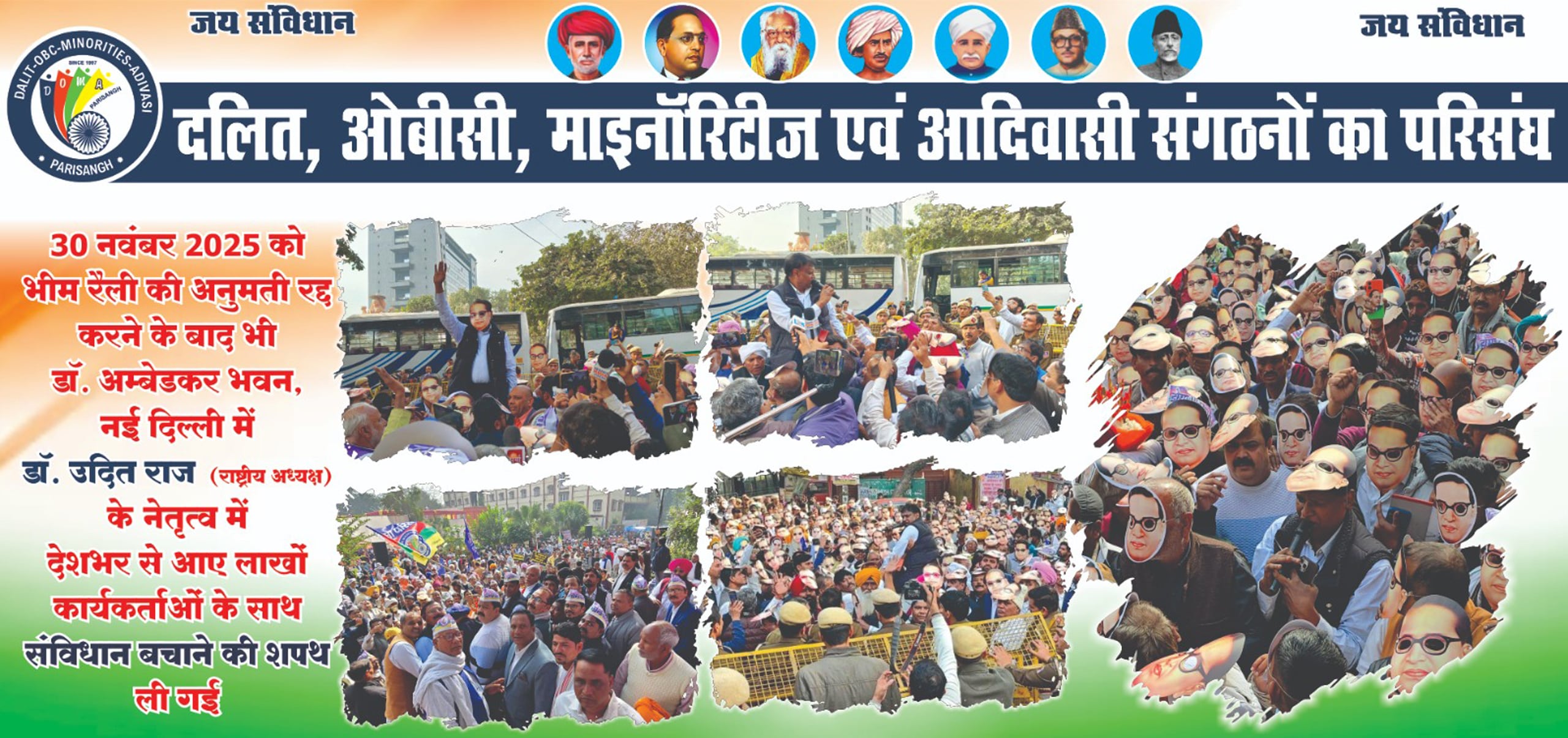 In 1997, the All India Confederation of SC/ST Organisations was formed under the leadership of Dr. Udit Raj ji and through this, continuous nationwide dharnas and big rallies were held in Delhi for saving reservation and other rights by getting 3 constitutional amendments done and success was achieved. On October 27, 2024, in the national convention held at the Constitution Club of India, New Delhi, it was unanimously decided to include OBCs and minorities in it and its name was changed to 'Confederation of Dalit, OBC, Minorities and Adivasi Organisations (DOMA Parisangh).